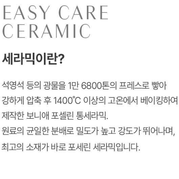 보니애 제품은 12T 포세린 통세라믹이라 굉장히 단단하고 내구성이 뛰어납니다. 쉽게 깨지거나 파손되지 않아요.