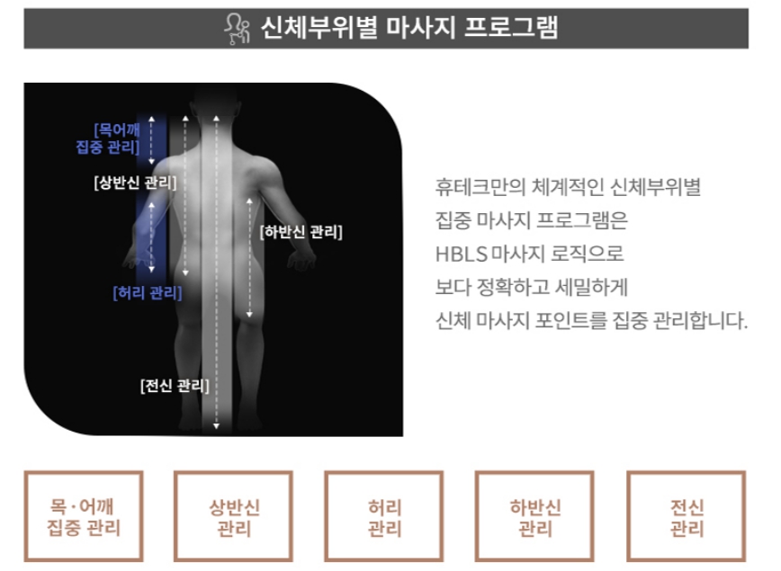 | 휴테크 | 음악 연동 마사지, 섬세한 어깨 마사지, 무중력 자세 특화 | 음악과 함께 힐링하고 싶거나, 목/어깨 결림이 심한 분 |