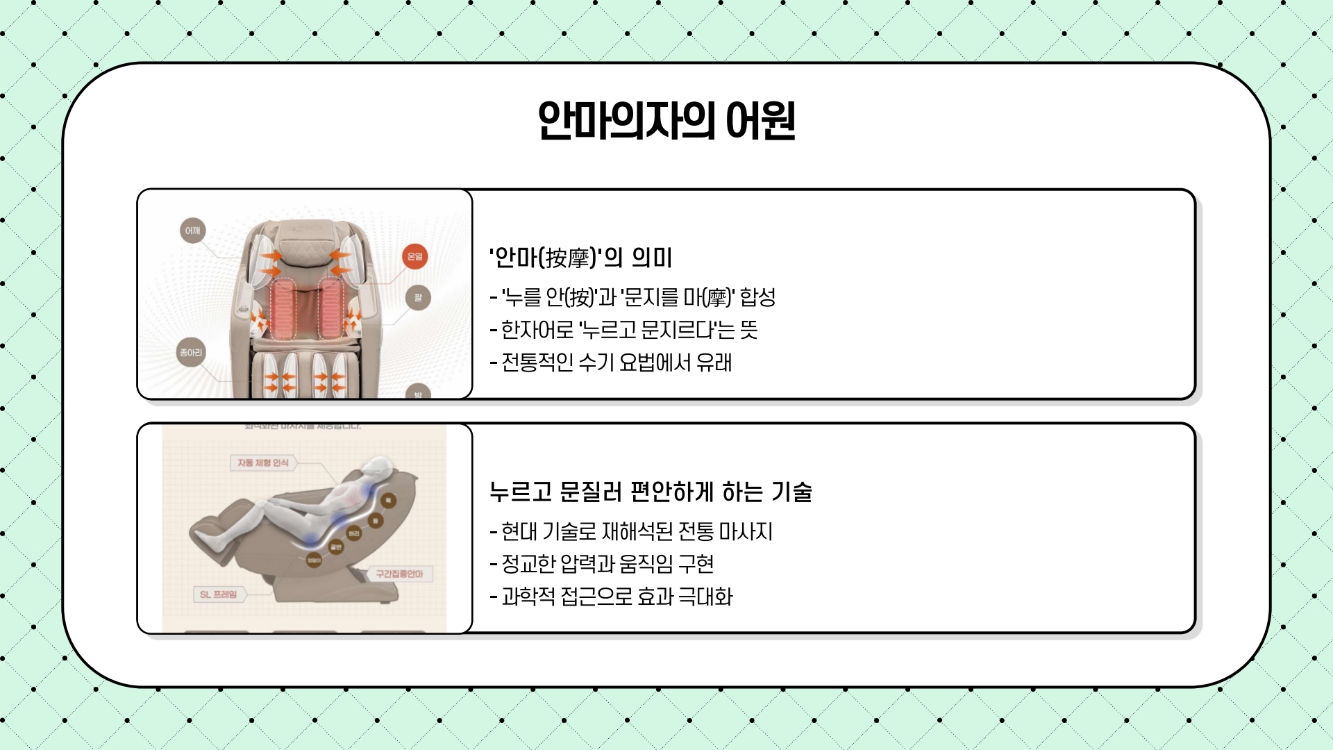 ‘안마(按摩)’는 ‘누를 안(按)’과 ‘문지를 마(摩)’를 합친 한자어로 “누르고 문질러 편안하게 한다”는 의미를 품고 있습니다. 전동식 가정용 모델은 1954년 일본 발명가 후지모토 노부오가 고안한 이후, 1980년대 후반 국내 백화점 시연 코너를 통해 대중화되었습니다. 현재는 IoT·음성제어·무중력 각도 조절 같은 스마트 기능을 탑재하며 웰니스 가전으로 진화하고 있습니다.