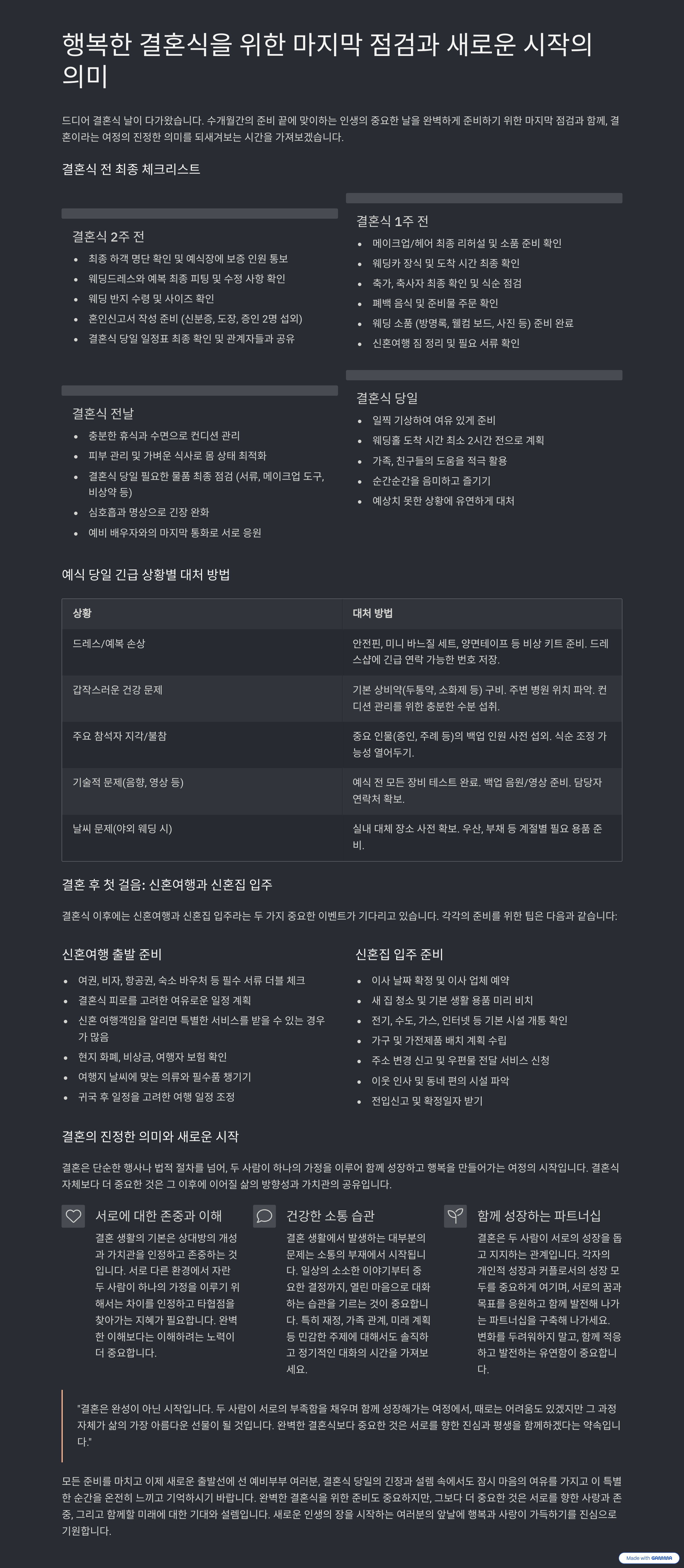 이 글에서 제시한 체크리스트와 조언들이 여러분의 결혼 준비에 작은 도움이 되기를 바랍니다.