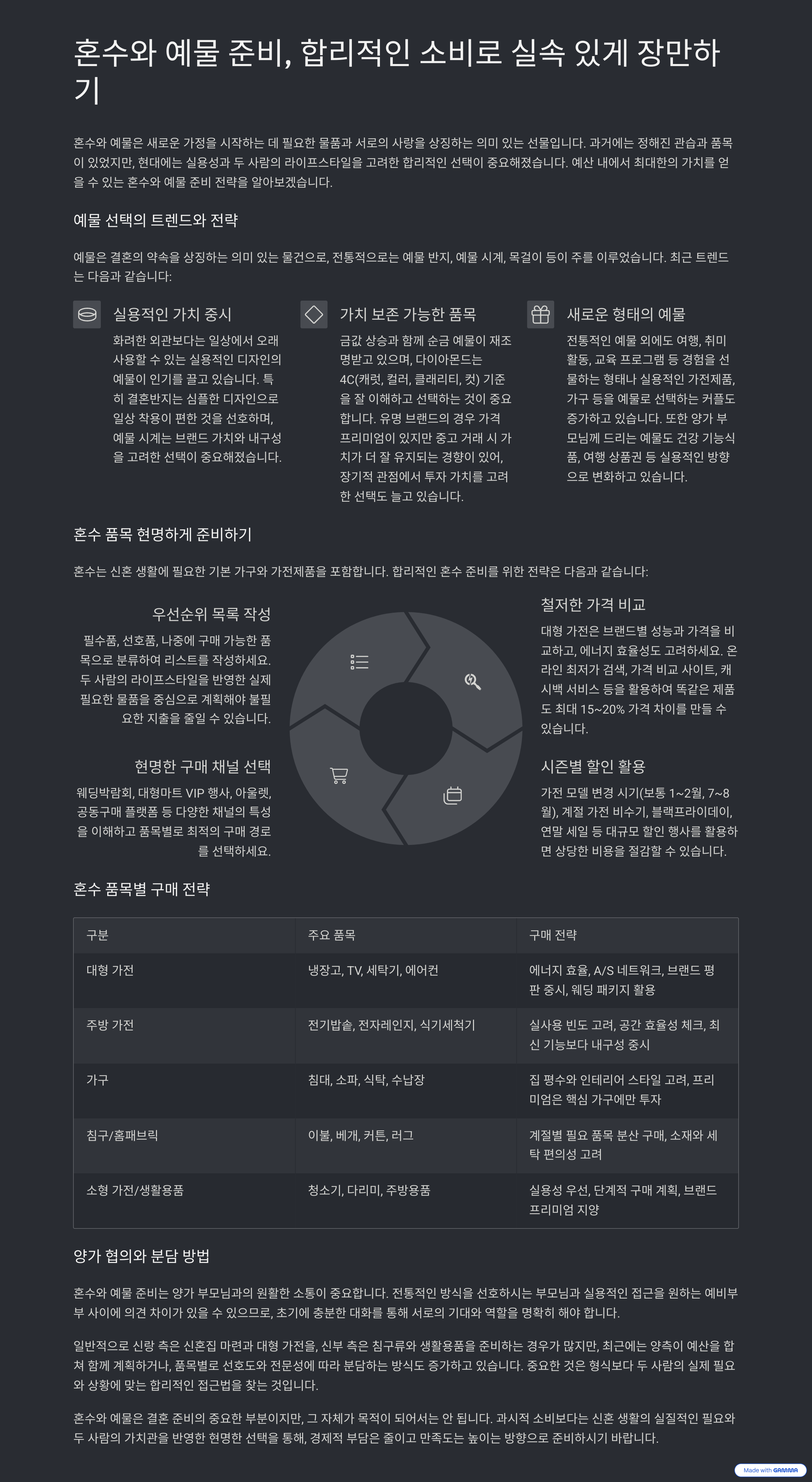 혼수는 가전제품, 가구, 주방용품, 침구류 등으로 구성되며, 두 분의 라이프스타일에 맞춰 필요한 것들만 구입하는 것이 중요합니다.